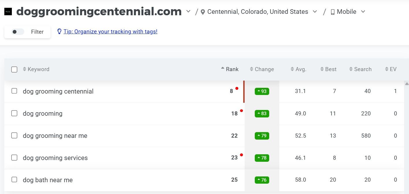 We bought Happy Paws Grooming which had no website, social media or much of any online presence. In less than a year we have organically ranked for the top keywords from page 10+ to page 2 and 3 and still making progress.